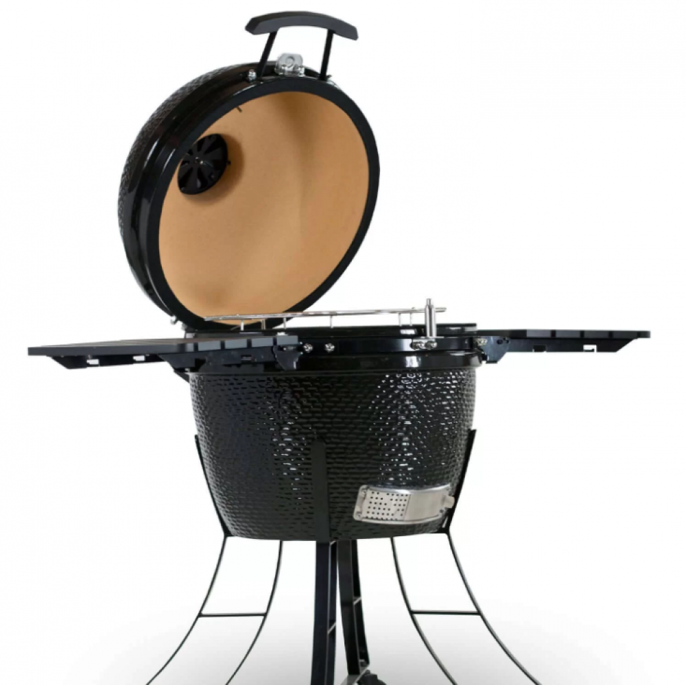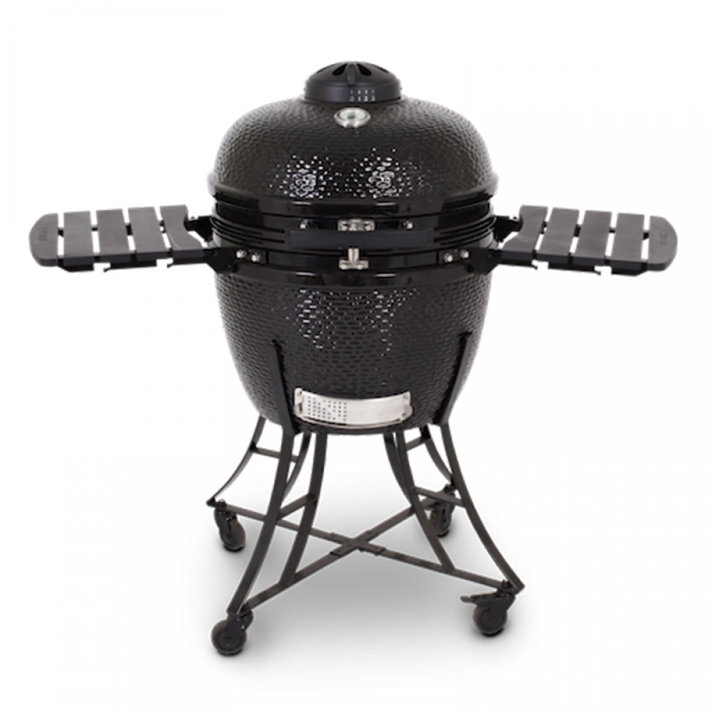 Temperaturen i grillen styrs med hjälp av ett värmereglage nere i botten av grillen men också på toppen av locket vilket gör att du både kan bränna på en köttbit i över 350°C men också köra en exempelvis en brisket med ”low and slow”-metoden då keramiken är så pass isolerande. Grillen kommer med en välbyggd benställning med hjul och hjullås och sidobord i plast som du enkelt kan fälla upp och ner.